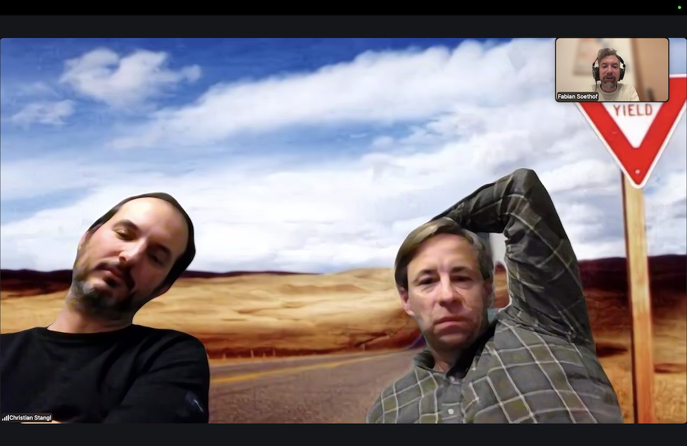 Männer über 40, die noch immer gerne auf Pearl-Jam-Konzerte gehen und dort bestimmt kurze Hosen tragen: Lukas Filipek, Christian Stangl und ich während unseres spätabendlichen Grunge-Talks via Video. Yield!