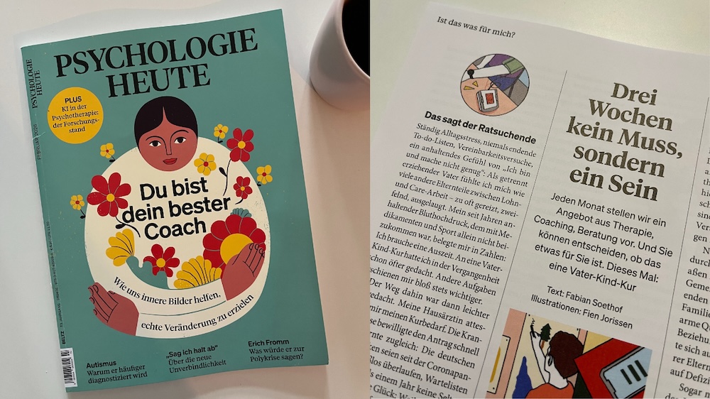 In der Rubrik „Ist das was für mich?“ stellt die Redaktion von „Psychologie Heute“ jeden Monat ein Angebot aus Therapie, Coaching oder Beratung vor. Für die Ausgabe Februar 2026 schrieb ich über meine Vater-Kind-Kur. Hier ein Auszug.